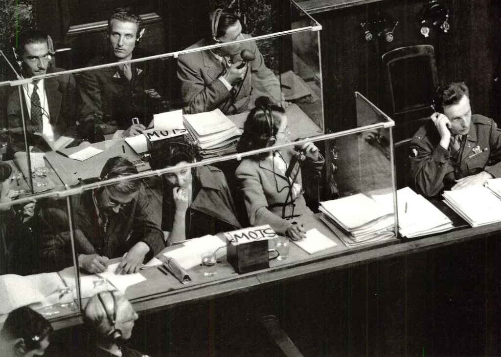 Drawing on the Filene-Finlay system previously used at the League of Nations, Dostert envisioned a fully integrated multilingual solution adapted to the high-stakes environment of a criminal tribunal. He proposed a daring solution: interpreters would render speech “as it was being delivered”, using headsets and microphones so that listeners in the courtroom could choose their preferred language channel.